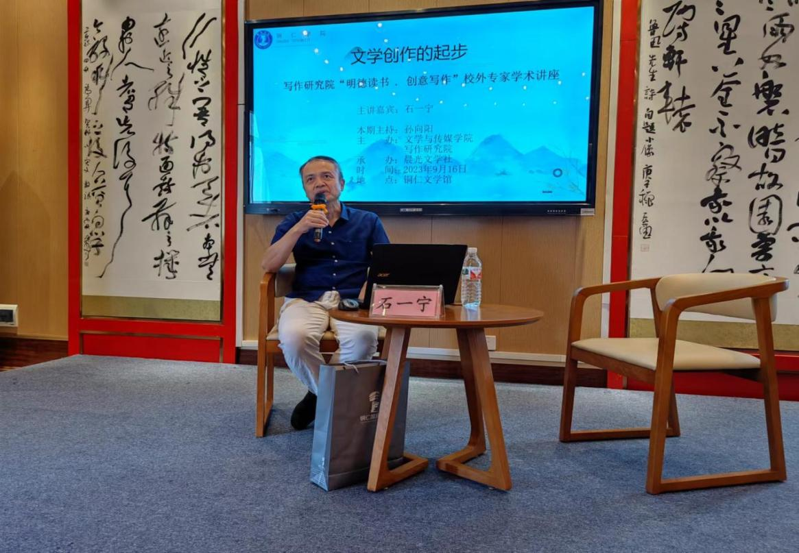 《民族文学》主编石一宁给晨光文学社社员讲课。