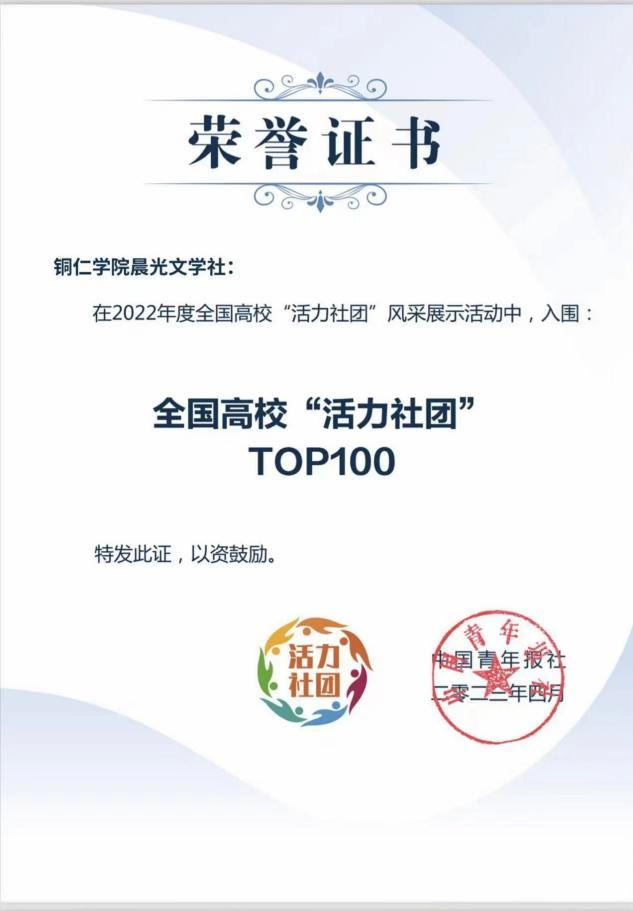 刚刚过去的2023年,铜仁学院文学教育成果斐然。据不完全统计,一年来,晨光文学社社员共有9人13件作品在全国各类大赛中获奖。在《诗刊》《星星》《青春》《中国校园文学》《鹿鸣》《散文诗》《南风》等众多国家级、省、市级文学公开刊物和文学内刊《梵净山》《黔东作家》《松桃文学》《晨光》发表文学小说、散文、诗歌50余篇(组)。同时,晨光文学社作为已成为贵州高校中颇为活跃的学生文学社团之一,在中国青年报社主办的全国高校“活力社团”风采展示活动中,成功入围“全国高校活力社团TOP100”。并在第六届贵州省大学生文学大赛“文学社团五强”榜首;在首届“乌马河·中国大学生中文创意书评大赛”中,获优秀组织奖。