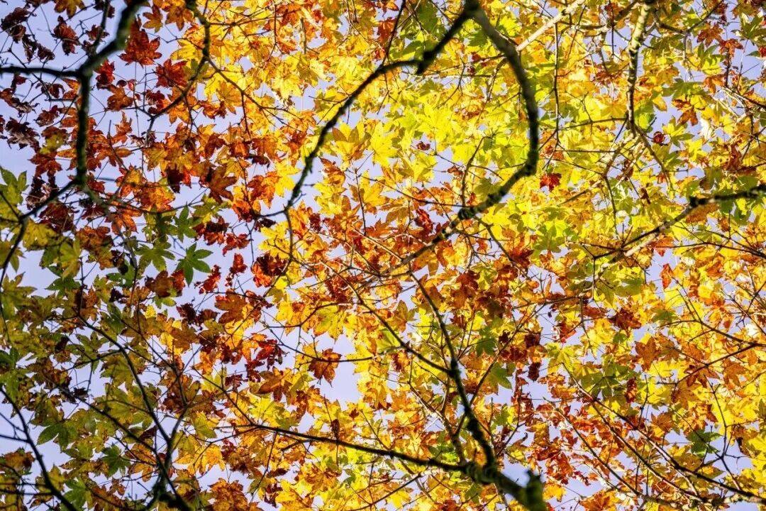 深绿、金黄、绯红的树叶交织成一幅巨大的油画,