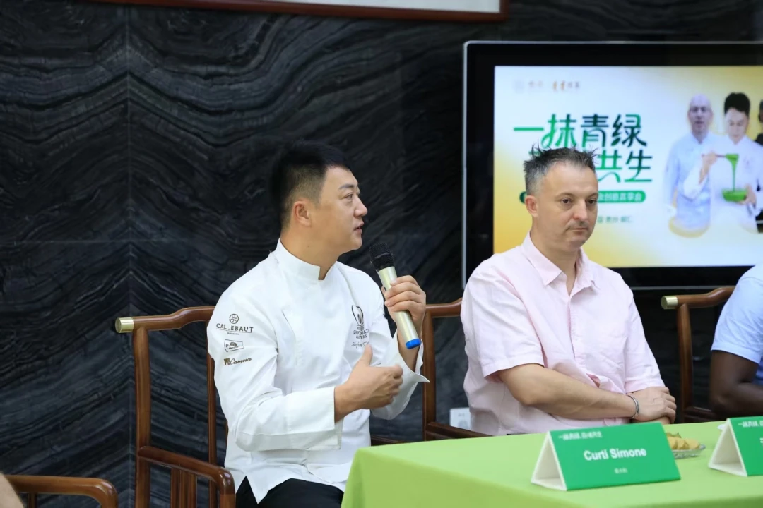 贵州抹茶中外地域美食创意共享会上汤昀鹏与来宾交流。