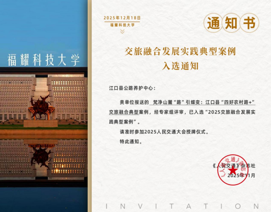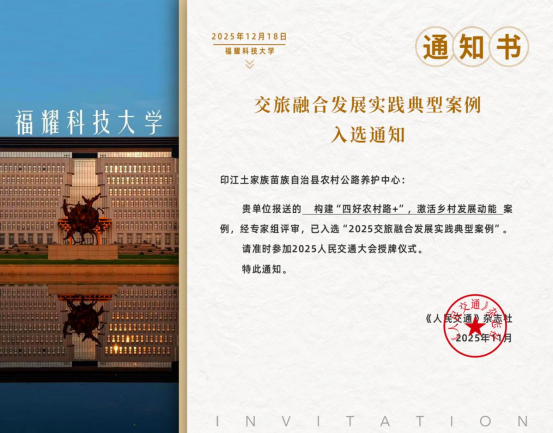 近日,《人民交通》杂志社、交通运输部“老交通”智库、福耀科技大学联合组织开展了交旅融合、交能融合、高速公路创新发展、最美回乡路、交通产学研一体化等领域典型案例征集工作,经过自主申报、省级推荐、专家评审等环节,铜仁市江口县《梵净山麓“路”引蝶变:江口县“四好农村路+”交旅融合典型案例》、印江土家族苗族自治县《构建“四好农村路+” 激活乡村发展动能》成功入选。