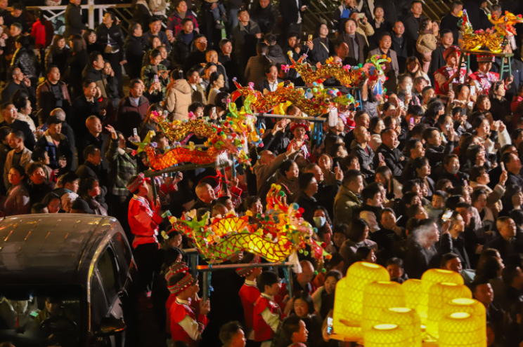 随着鼓点愈发急促,板凳龙们仿佛被赋予了生命,在街头巷尾蜿蜒游动。时而齐齐高举,如游龙探云,气势恢宏;时而缓缓低伏,似潜龙入海,沉稳灵动;时而首尾相接盘旋成圈,若九龙戏珠,妙趣横生;时而四散腾跃,像猛龙过江,酣畅淋漓。土家小伙们默契十足,脚步踏着急促的节拍,汗水浸湿了衣摆却依旧笑容灿烂,那质朴而震撼的表演,将人们对美好生活的向往融入每一个动作,所到之处,人声鼎沸,市民与游客纷纷驻足围观,拿出手机记录下这难得一见的视觉奇观,快门声与喝彩声此起彼伏,为冬日的小城注入了滚烫的活力。
