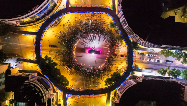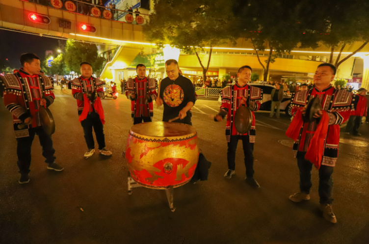 11月25日,夜幕低垂,印江自治县主城区早已流光璀璨。沿街的灯火次第亮起,与天边的暮色交织成温暖的光晕,忽然间,阵阵鼓声从街角传来,裹挟着清脆的民歌,打破了夜色的静谧。循声望去,身着土家传统服饰的小伙们,各自正手举着两米长的板凳龙,从环形天桥周边主街道的各个路口鱼贯而出。这些板凳龙以坚硬木料为骨,凳面上糊着色彩艳丽的彩纸,精心绘制的龙鳞在灯光下熠熠生辉,每一节都承载着匠人的巧思与祖辈的期盼。