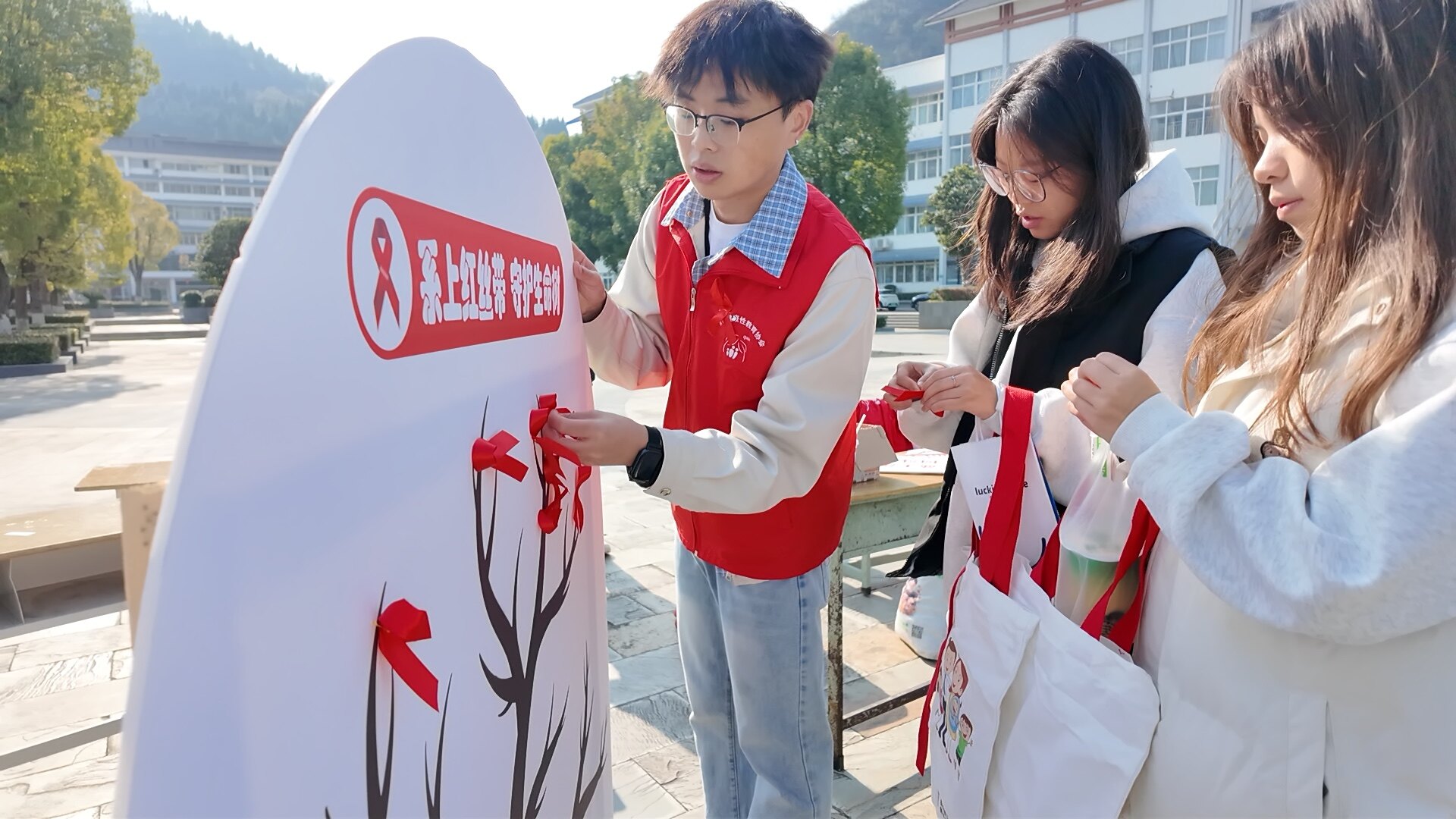 活动在多个校区同步展开。现场气氛热烈,醒目的“社会共治,守正创新,终结艾滋”主题签名墙前,师生们纷纷驻足,郑重签下自己的名字,承诺做自己健康的第一责任人,每一名参与签名的师生都获赠一枚象征关爱与希望的红丝带,并领取艾滋病防治知识手册、人口国情国策宣传资料及实用健康宣传品。一张张青春的面庞在签名墙前定格,一条条红丝带在校园中传递,“防艾”的种子也在潜移默化中播撒进青年心中。