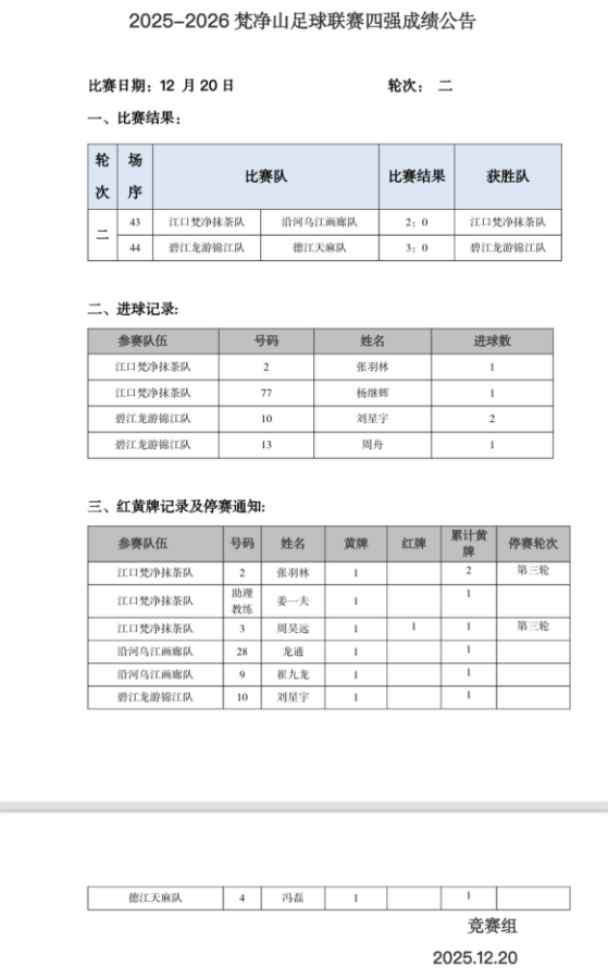 12月20日,2025-2026梵净山足球联赛(梵超)第二阶段四强循环赛第二轮两场对决落下帷幕。江口梵净抹茶队凭借主场优势2:0力克此前领跑的沿河乌江画廊队,实现两连胜;碧江龙游锦江队则以3:0的比分战胜德江天麻队,收获阶段赛首胜。