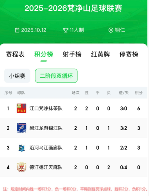 本轮比赛结果使得积分榜形势发生显著变化,江口队全取三分后占据榜首位置。