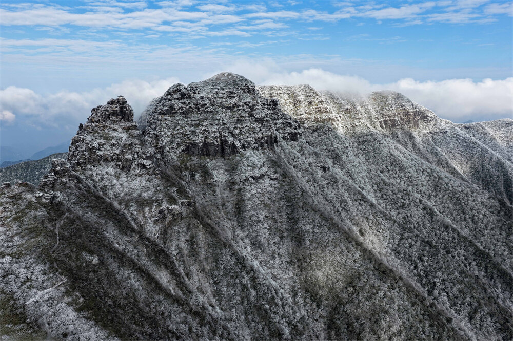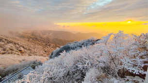 1月6日,雪霁初晴,世界自然遗产地梵净山迎来绝美雾凇盛景,漫山雾凇晶莹剔透,日出暖阳倾洒峰峦,冰雪世界瞬间被点亮,如梦如幻,雾凇与金光相映,勾勒出一幅绝美冬日画卷,尽是温暖和煦的冬日诗意。