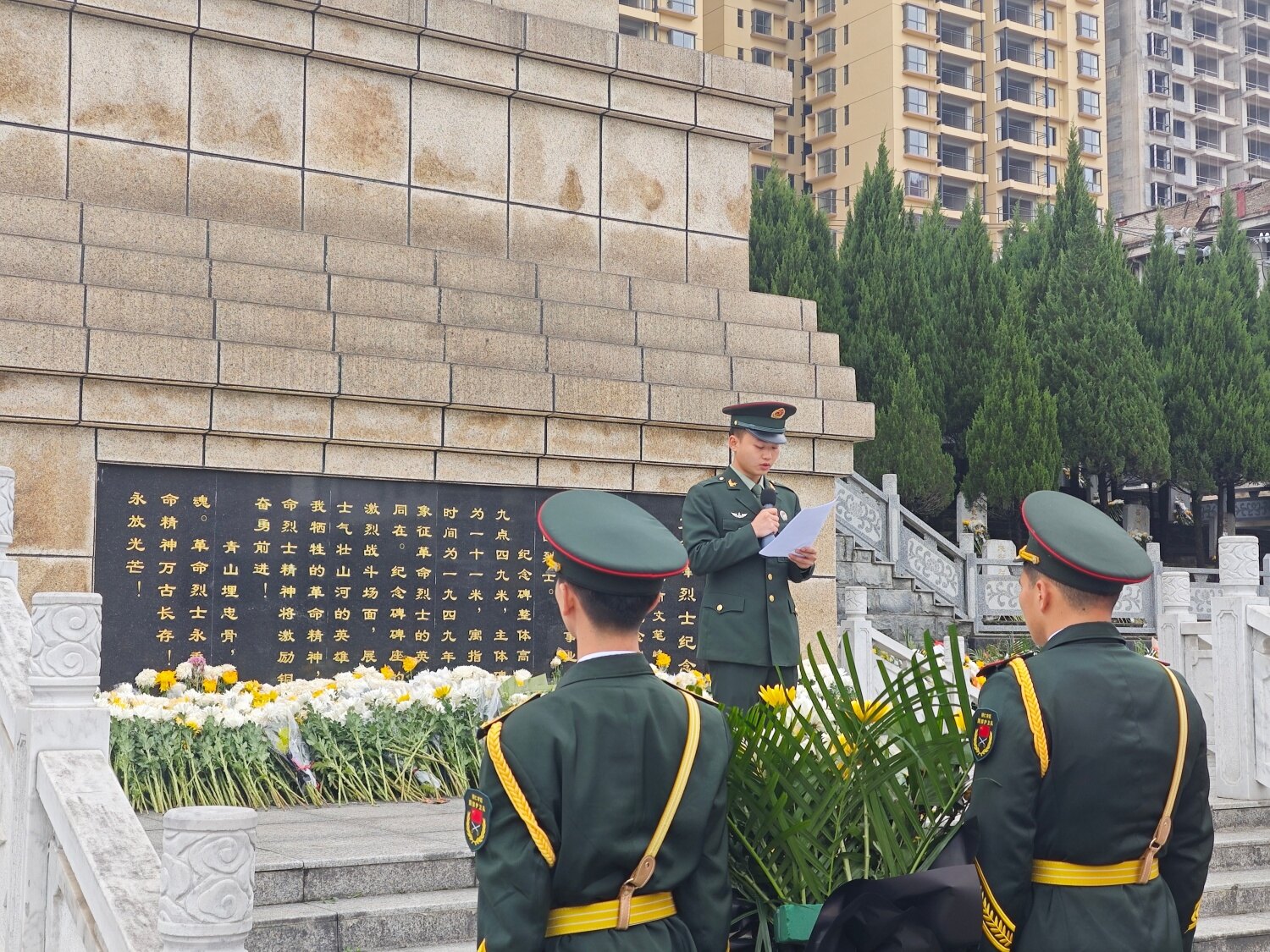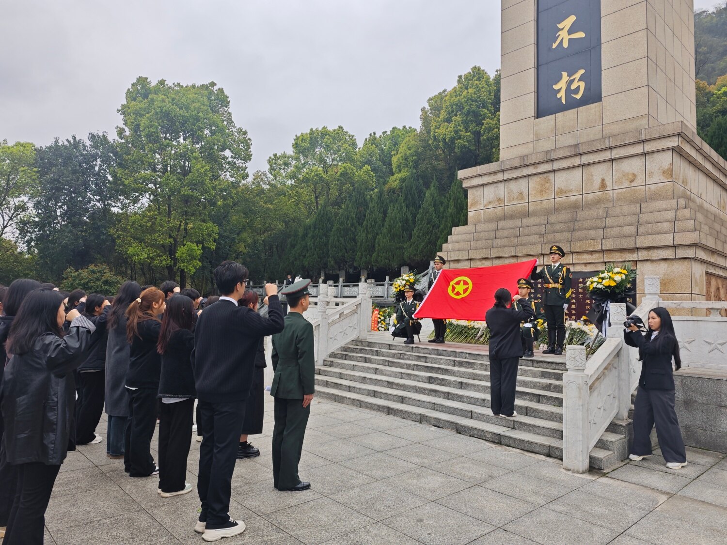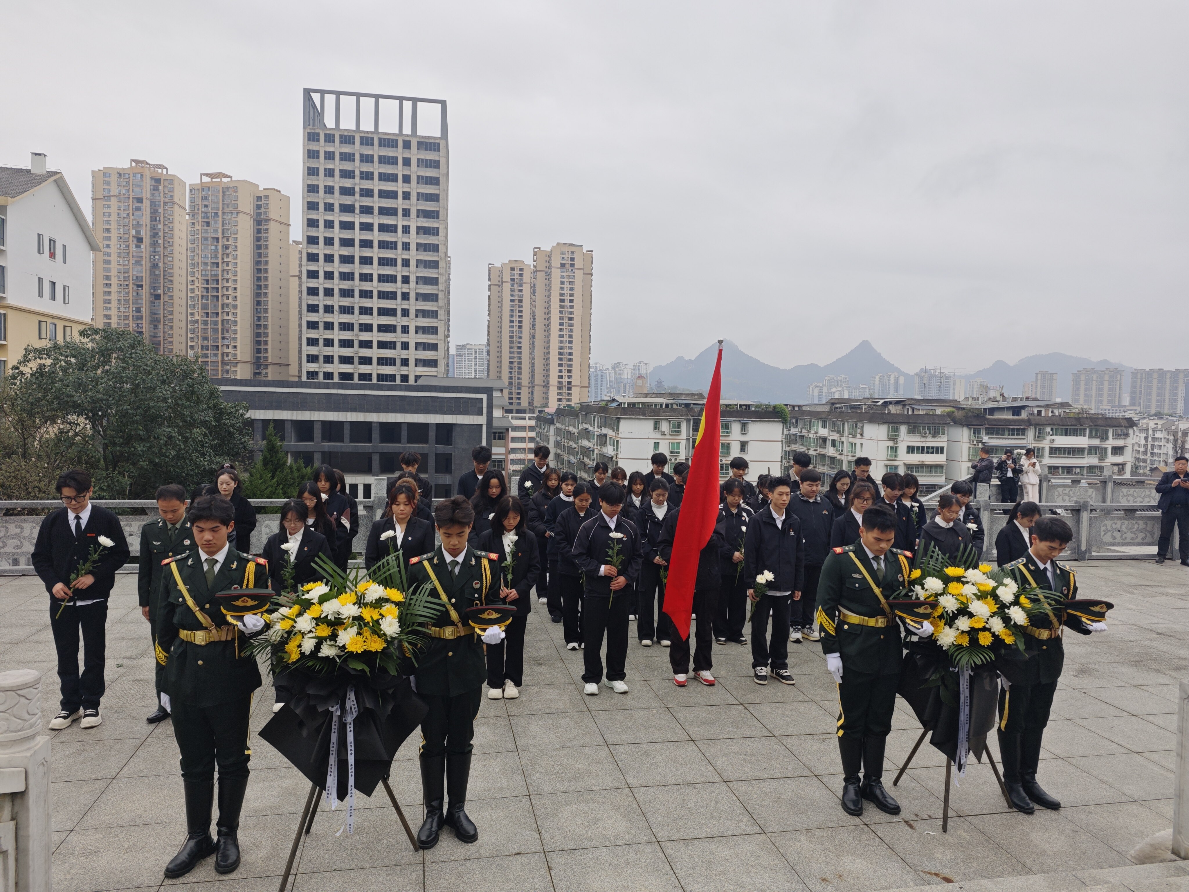 当日的文笔峰烈士陵园内,庄严肃穆的氛围萦绕四周。铜仁学院40余名学生代表身着整洁服装,列队整齐、神情肃穆,怀揣着对革命先烈的无限敬仰与深切哀思,整齐伫立在革命烈士纪念碑前。活动伊始,学生代表手抬花篮,缓步走向纪念碑,郑重地将花篮摆放于基座之上,寄托对先烈的无尽追思。随后,全体人员低头肃立,集体默哀三分钟,向为国家独立、民族解放、人民幸福英勇献身的革命英烈,致以最崇高的敬意。